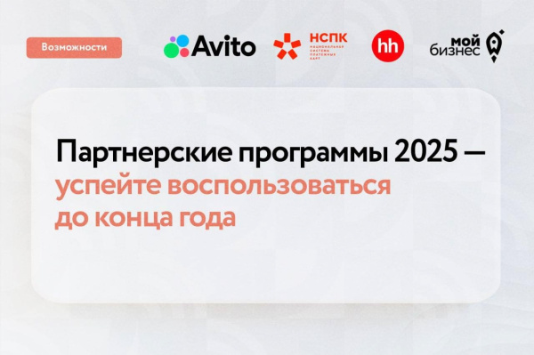 До конца года продолжают действовать партнерские программы «Мой бизнес» — вместе с Авито, НСПК и hh.ru. Они помогают предпринимателям развивать продажи, находить сотрудников и привлекать клиентов.