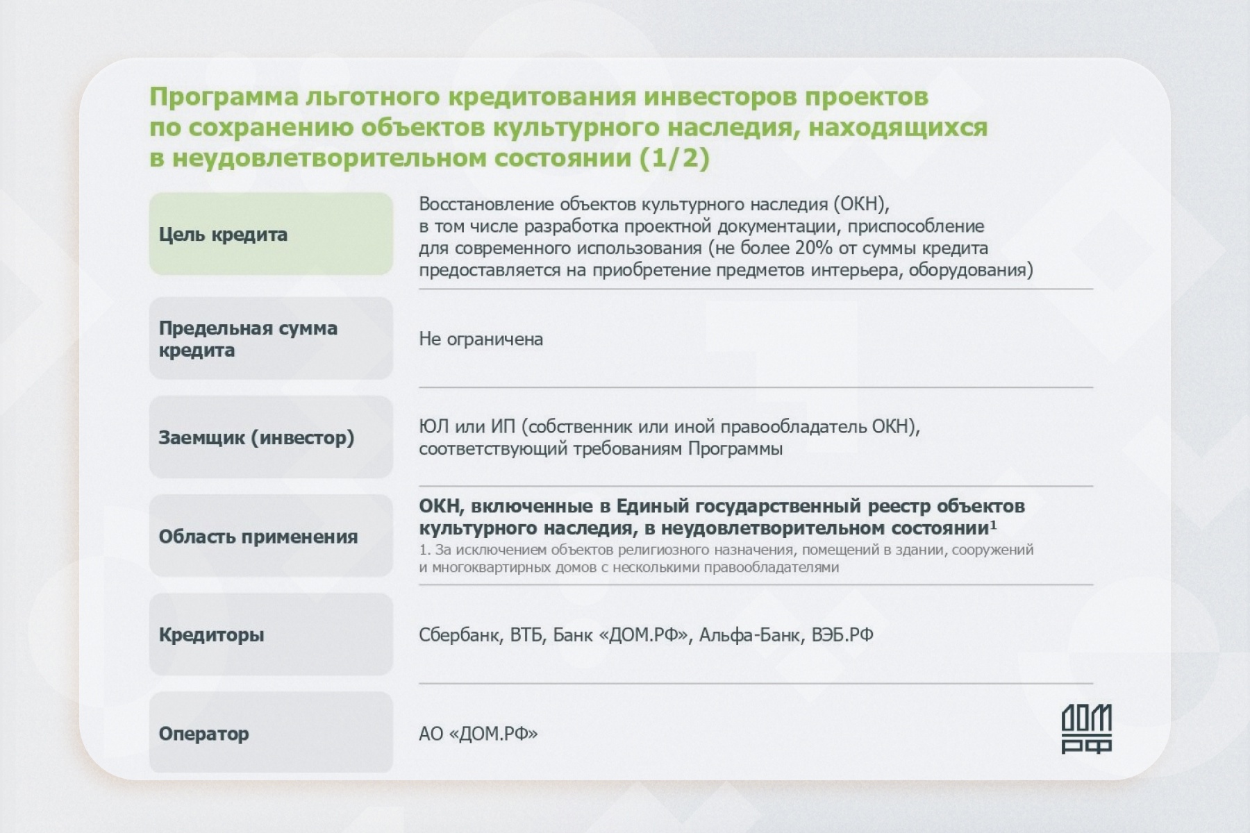 Инвесторы, готовые вложиться в сохранение и восстановление памятников архитектуры, могут воспользоваться программой льготного кредитования от АО «ДОМ.РФ».