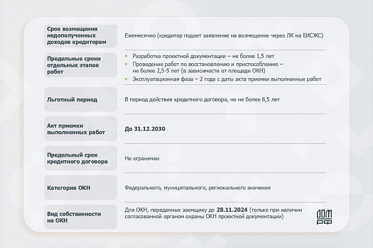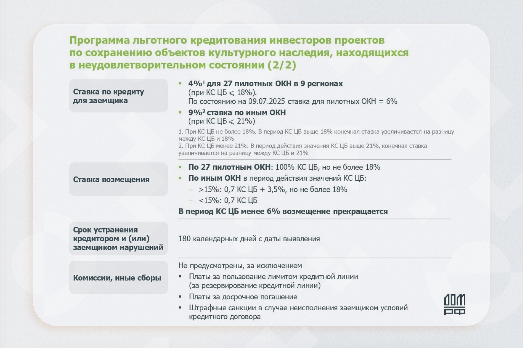 - Ставка — 9% годовых для проектов по восстановлению ОКН