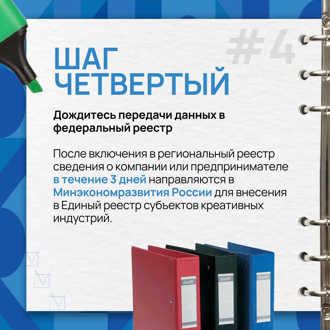 Подготовили ПОШАГОВЫЙ ГАЙД для креативных предпринимателей — где искать ответственный орган в регионе, как подать заявку и каким образом данные попадают в федеральный реестр.