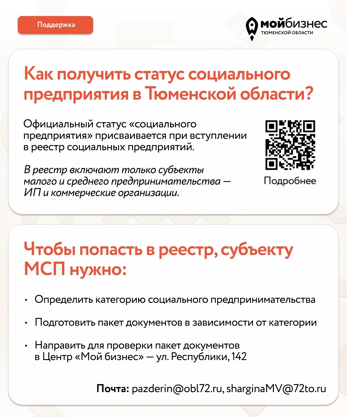 Проконсультироваться можно со специалистами Центра «Мой бизнес» по телефону: 8 (3452) 49-99-44, доб. 242