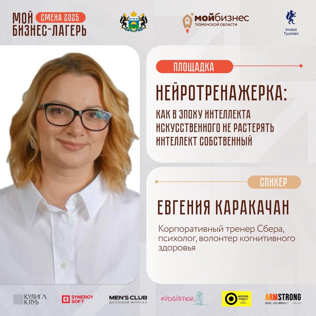 - Евгения Каракачан — корпоративный тренер Сбера, психолог, волонтёр когнитивного здоровья